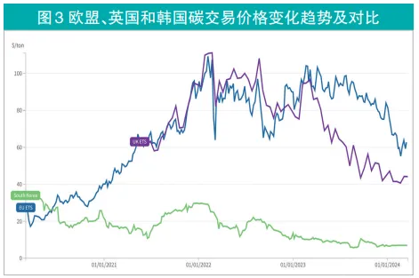 UK ETS启动以来,碳价始终接近或高于EU ETS碳价,但在2023年下半年出现暴跌。起因是2023年7月,UK ETS宣布了一系列改革计划,旨在从2024年起加强对工业、电力和航空等行业的碳排放限制,并于2026年起纳入新行业。但为了确保企业能够进行平稳过渡,英国ETS管理局将在2024年—2027年间向市场发放5350万个额外配额,导致二氧化碳的排放成本降低,也意味着工业部门需要承担的碳成本将降低。也正因此,2023年末,UK ETS碳价降至65美元/吨,较2022年末降低1/3。