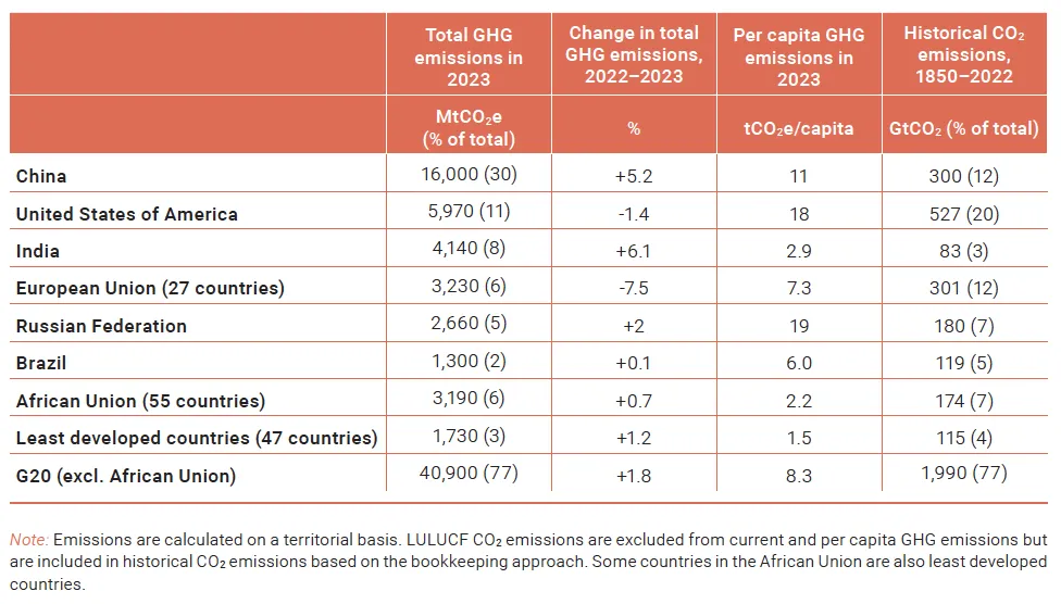 图4. 一些国家和地区的2023年排放、人均排放和历史排放。(来源:UNEP《2024排放差距报告》)