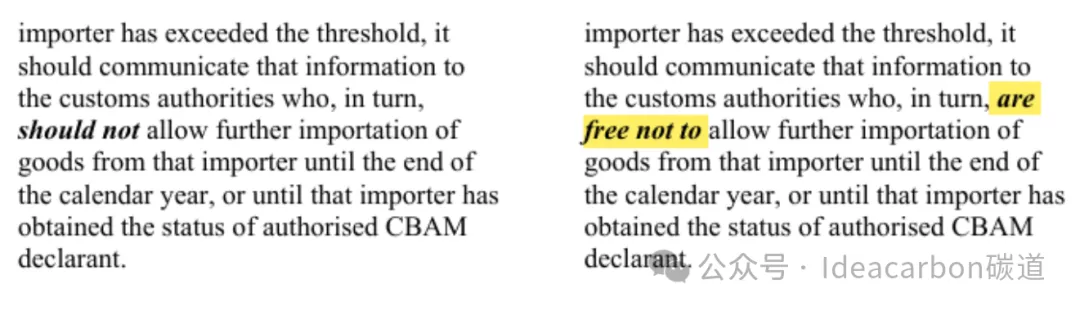 在原提案中,对于超出阈值但没有申报CBAM的进口商,欧盟规定在日历年结束之前或进口商获得申报资格前,海关不允许(should not)从该进口商进口货物,而修正案草案中将“should not”改为“are free not to”,意思也就是说对于海关允不允许当年从不符合规定的进口商继续进口货物由“欧盟主观的建议说海关当局你不能允许”到现在的“欧盟以一种中立、宽容的说法将这一选择权交给海关当局——你可以不允许”。如若实施,具体的说法我们还要看海关当局如何抉择。