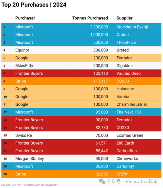 如下图所示,这家科技巨头一直是碳减排信用的最大买家,在2024年购买了约500万吨碳信用。