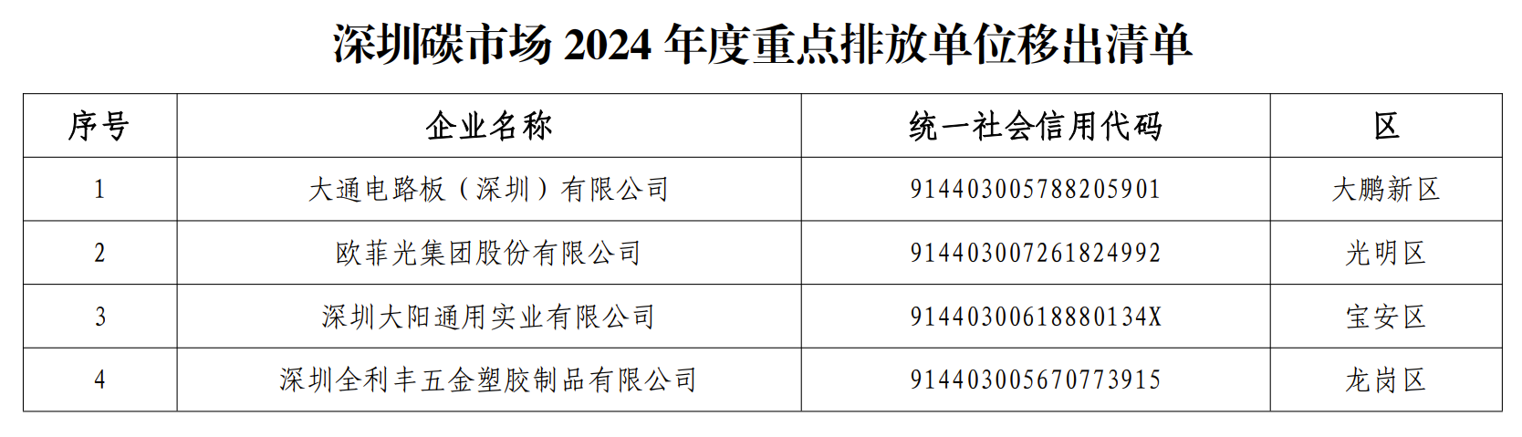 摘要:深圳市生态环境局关于4家碳排放单位移出2024年度重点排放单位名单的通知