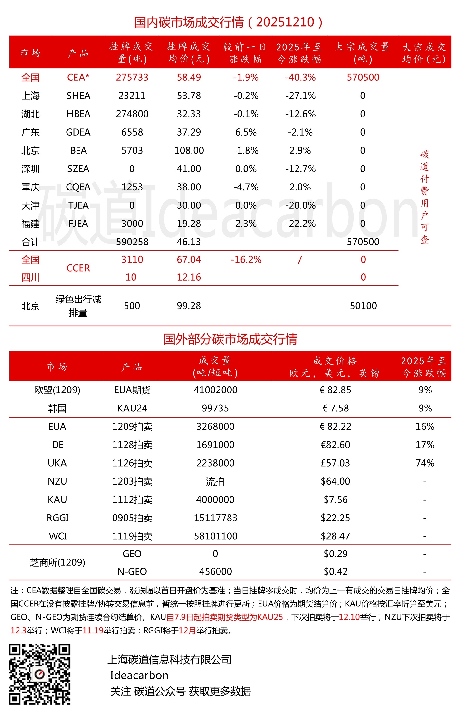 摘要:全国碳配额CEA发生570500吨大宗协议转让,成交均较市场价高13.16%